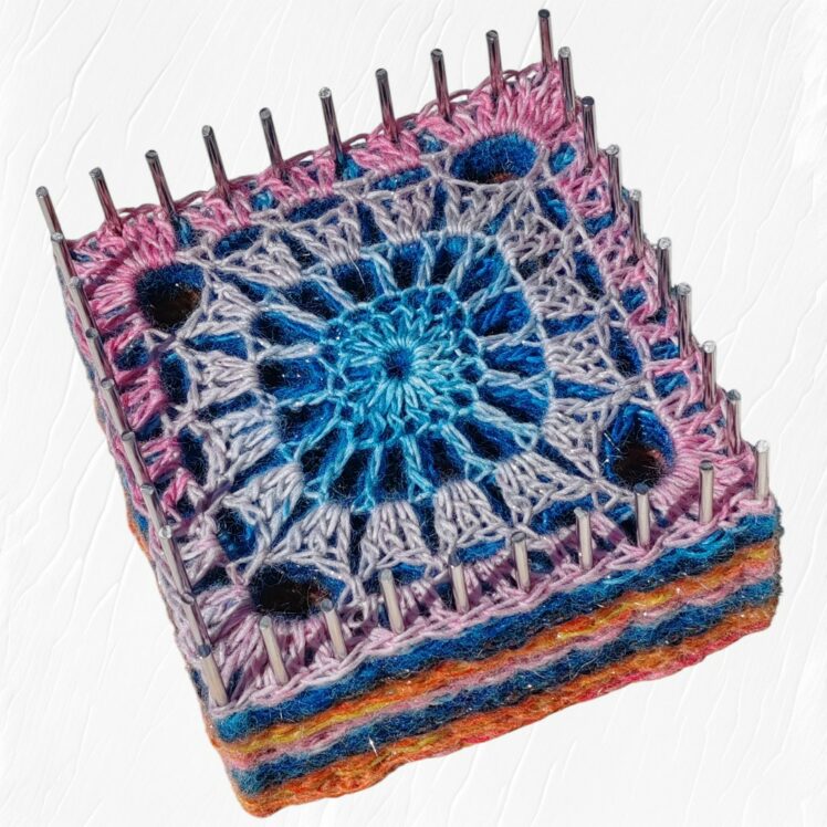 Une fois l’ensemble des tous les grannies crochetés, ils furent bloqués avant de pouvoir ensuite les assembler.